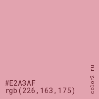 Цвет #E2A3AF в цветовой модели RGB обозначается тремя октетами (226, 163, 175) в десятичном формате и #E2A3AF в шестнадцатиричном (hex) формате, которые являются интенсивностью красного 226 (hex E2), интенсивность зелёного 163 (hex A3) и интенсивность синего 175 (hex AF).