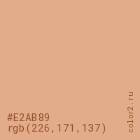 Цвет #E2AB89 в цветовой модели RGB обозначается тремя октетами (226, 171, 137) в десятичном формате и #E2AB89 в шестнадцатиричном (hex) формате, которые являются интенсивностью красного 226 (hex E2), интенсивность зелёного 171 (hex AB) и интенсивность синего 137 (hex 89).
