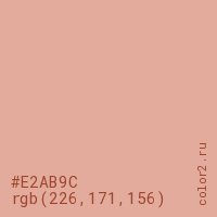 Цвет #E2AB9C в цветовой модели RGB обозначается тремя октетами (226, 171, 156) в десятичном формате и #E2AB9C в шестнадцатиричном (hex) формате, которые являются интенсивностью красного 226 (hex E2), интенсивность зелёного 171 (hex AB) и интенсивность синего 156 (hex 9C).