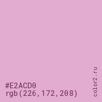 Цвет #E2ACD0 в цветовой модели RGB обозначается тремя октетами (226, 172, 208) в десятичном формате и #E2ACD0 в шестнадцатиричном (hex) формате, которые являются интенсивностью красного 226 (hex E2), интенсивность зелёного 172 (hex AC) и интенсивность синего 208 (hex D0).