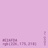 Цвет #E2AFDA в цветовой модели RGB обозначается тремя октетами (226, 175, 218) в десятичном формате и #E2AFDA в шестнадцатиричном (hex) формате, которые являются интенсивностью красного 226 (hex E2), интенсивность зелёного 175 (hex AF) и интенсивность синего 218 (hex DA).