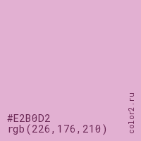 Цвет #E2B0D2 в цветовой модели RGB обозначается тремя октетами (226, 176, 210) в десятичном формате и #E2B0D2 в шестнадцатиричном (hex) формате, которые являются интенсивностью красного 226 (hex E2), интенсивность зелёного 176 (hex B0) и интенсивность синего 210 (hex D2).
