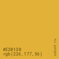 Цвет #E2B138 в цветовой модели RGB обозначается тремя октетами (226, 177, 56) в десятичном формате и #E2B138 в шестнадцатиричном (hex) формате, которые являются интенсивностью красного 226 (hex E2), интенсивность зелёного 177 (hex B1) и интенсивность синего 56 (hex 38).