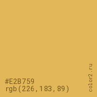 Цвет #E2B759 в цветовой модели RGB обозначается тремя октетами (226, 183, 89) в десятичном формате и #E2B759 в шестнадцатиричном (hex) формате, которые являются интенсивностью красного 226 (hex E2), интенсивность зелёного 183 (hex B7) и интенсивность синего 89 (hex 59).