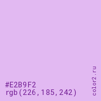 Цвет #E2B9F2 в цветовой модели RGB обозначается тремя октетами (226, 185, 242) в десятичном формате и #E2B9F2 в шестнадцатиричном (hex) формате, которые являются интенсивностью красного 226 (hex E2), интенсивность зелёного 185 (hex B9) и интенсивность синего 242 (hex F2).