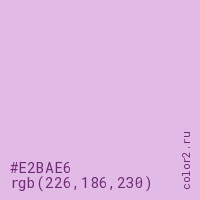 Цвет #E2BAE6 в цветовой модели RGB обозначается тремя октетами (226, 186, 230) в десятичном формате и #E2BAE6 в шестнадцатиричном (hex) формате, которые являются интенсивностью красного 226 (hex E2), интенсивность зелёного 186 (hex BA) и интенсивность синего 230 (hex E6).