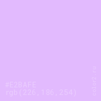 Цвет #E2BAFE в цветовой модели RGB обозначается тремя октетами (226, 186, 254) в десятичном формате и #E2BAFE в шестнадцатиричном (hex) формате, которые являются интенсивностью красного 226 (hex E2), интенсивность зелёного 186 (hex BA) и интенсивность синего 254 (hex FE).