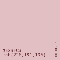 Цвет #E2BFC3 в цветовой модели RGB обозначается тремя октетами (226, 191, 195) в десятичном формате и #E2BFC3 в шестнадцатиричном (hex) формате, которые являются интенсивностью красного 226 (hex E2), интенсивность зелёного 191 (hex BF) и интенсивность синего 195 (hex C3).