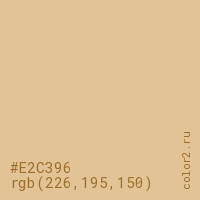 Цвет #E2C396 в цветовой модели RGB обозначается тремя октетами (226, 195, 150) в десятичном формате и #E2C396 в шестнадцатиричном (hex) формате, которые являются интенсивностью красного 226 (hex E2), интенсивность зелёного 195 (hex C3) и интенсивность синего 150 (hex 96).
