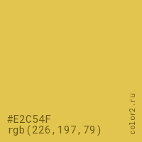 Цвет #E2C54F в цветовой модели RGB обозначается тремя октетами (226, 197, 79) в десятичном формате и #E2C54F в шестнадцатиричном (hex) формате, которые являются интенсивностью красного 226 (hex E2), интенсивность зелёного 197 (hex C5) и интенсивность синего 79 (hex 4F).