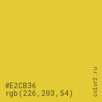 Цвет #E2CB36 в цветовой модели RGB обозначается тремя октетами (226, 203, 54) в десятичном формате и #E2CB36 в шестнадцатиричном (hex) формате, которые являются интенсивностью красного 226 (hex E2), интенсивность зелёного 203 (hex CB) и интенсивность синего 54 (hex 36).