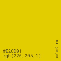 Цвет #E2CD01 в цветовой модели RGB обозначается тремя октетами (226, 205, 1) в десятичном формате и #E2CD01 в шестнадцатиричном (hex) формате, которые являются интенсивностью красного 226 (hex E2), интенсивность зелёного 205 (hex CD) и интенсивность синего 1 (hex 01).