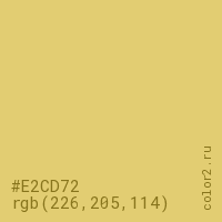 Цвет #E2CD72 в цветовой модели RGB обозначается тремя октетами (226, 205, 114) в десятичном формате и #E2CD72 в шестнадцатиричном (hex) формате, которые являются интенсивностью красного 226 (hex E2), интенсивность зелёного 205 (hex CD) и интенсивность синего 114 (hex 72).