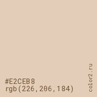 Цвет #E2CEB8 в цветовой модели RGB обозначается тремя октетами (226, 206, 184) в десятичном формате и #E2CEB8 в шестнадцатиричном (hex) формате, которые являются интенсивностью красного 226 (hex E2), интенсивность зелёного 206 (hex CE) и интенсивность синего 184 (hex B8).