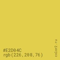 Цвет #E2D04C в цветовой модели RGB обозначается тремя октетами (226, 208, 76) в десятичном формате и #E2D04C в шестнадцатиричном (hex) формате, которые являются интенсивностью красного 226 (hex E2), интенсивность зелёного 208 (hex D0) и интенсивность синего 76 (hex 4C).