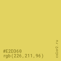 Цвет #E2D360 в цветовой модели RGB обозначается тремя октетами (226, 211, 96) в десятичном формате и #E2D360 в шестнадцатиричном (hex) формате, которые являются интенсивностью красного 226 (hex E2), интенсивность зелёного 211 (hex D3) и интенсивность синего 96 (hex 60).