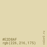 Цвет #E2D8AF в цветовой модели RGB обозначается тремя октетами (226, 216, 175) в десятичном формате и #E2D8AF в шестнадцатиричном (hex) формате, которые являются интенсивностью красного 226 (hex E2), интенсивность зелёного 216 (hex D8) и интенсивность синего 175 (hex AF).