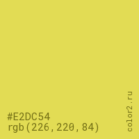 Цвет #E2DC54 в цветовой модели RGB обозначается тремя октетами (226, 220, 84) в десятичном формате и #E2DC54 в шестнадцатиричном (hex) формате, которые являются интенсивностью красного 226 (hex E2), интенсивность зелёного 220 (hex DC) и интенсивность синего 84 (hex 54).