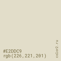 Цвет #E2DDC9 в цветовой модели RGB обозначается тремя октетами (226, 221, 201) в десятичном формате и #E2DDC9 в шестнадцатиричном (hex) формате, которые являются интенсивностью красного 226 (hex E2), интенсивность зелёного 221 (hex DD) и интенсивность синего 201 (hex C9).