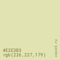Цвет #E2E3B3 в цветовой модели RGB обозначается тремя октетами (226, 227, 179) в десятичном формате и #E2E3B3 в шестнадцатиричном (hex) формате, которые являются интенсивностью красного 226 (hex E2), интенсивность зелёного 227 (hex E3) и интенсивность синего 179 (hex B3).