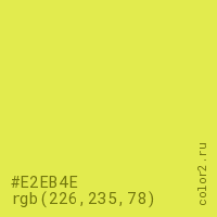 Цвет #E2EB4E в цветовой модели RGB обозначается тремя октетами (226, 235, 78) в десятичном формате и #E2EB4E в шестнадцатиричном (hex) формате, которые являются интенсивностью красного 226 (hex E2), интенсивность зелёного 235 (hex EB) и интенсивность синего 78 (hex 4E).