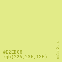 Цвет #E2EB88 в цветовой модели RGB обозначается тремя октетами (226, 235, 136) в десятичном формате и #E2EB88 в шестнадцатиричном (hex) формате, которые являются интенсивностью красного 226 (hex E2), интенсивность зелёного 235 (hex EB) и интенсивность синего 136 (hex 88).