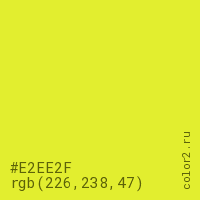 Цвет #E2EE2F в цветовой модели RGB обозначается тремя октетами (226, 238, 47) в десятичном формате и #E2EE2F в шестнадцатиричном (hex) формате, которые являются интенсивностью красного 226 (hex E2), интенсивность зелёного 238 (hex EE) и интенсивность синего 47 (hex 2F).