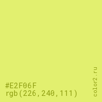 Цвет #E2F06F в цветовой модели RGB обозначается тремя октетами (226, 240, 111) в десятичном формате и #E2F06F в шестнадцатиричном (hex) формате, которые являются интенсивностью красного 226 (hex E2), интенсивность зелёного 240 (hex F0) и интенсивность синего 111 (hex 6F).