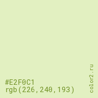 Цвет #E2F0C1 в цветовой модели RGB обозначается тремя октетами (226, 240, 193) в десятичном формате и #E2F0C1 в шестнадцатиричном (hex) формате, которые являются интенсивностью красного 226 (hex E2), интенсивность зелёного 240 (hex F0) и интенсивность синего 193 (hex C1).