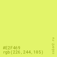 Цвет #E2F469 в цветовой модели RGB обозначается тремя октетами (226, 244, 105) в десятичном формате и #E2F469 в шестнадцатиричном (hex) формате, которые являются интенсивностью красного 226 (hex E2), интенсивность зелёного 244 (hex F4) и интенсивность синего 105 (hex 69).