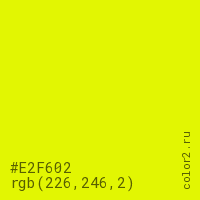 Цвет #E2F602 в цветовой модели RGB обозначается тремя октетами (226, 246, 2) в десятичном формате и #E2F602 в шестнадцатиричном (hex) формате, которые являются интенсивностью красного 226 (hex E2), интенсивность зелёного 246 (hex F6) и интенсивность синего 2 (hex 02).