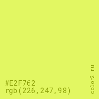 Цвет #E2F762 в цветовой модели RGB обозначается тремя октетами (226, 247, 98) в десятичном формате и #E2F762 в шестнадцатиричном (hex) формате, которые являются интенсивностью красного 226 (hex E2), интенсивность зелёного 247 (hex F7) и интенсивность синего 98 (hex 62).