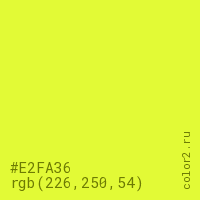Цвет #E2FA36 в цветовой модели RGB обозначается тремя октетами (226, 250, 54) в десятичном формате и #E2FA36 в шестнадцатиричном (hex) формате, которые являются интенсивностью красного 226 (hex E2), интенсивность зелёного 250 (hex FA) и интенсивность синего 54 (hex 36).