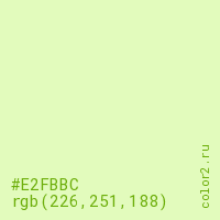 Цвет #E2FBBC в цветовой модели RGB обозначается тремя октетами (226, 251, 188) в десятичном формате и #E2FBBC в шестнадцатиричном (hex) формате, которые являются интенсивностью красного 226 (hex E2), интенсивность зелёного 251 (hex FB) и интенсивность синего 188 (hex BC).