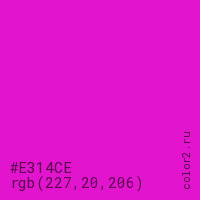 Цвет #E314CE в цветовой модели RGB обозначается тремя октетами (227, 20, 206) в десятичном формате и #E314CE в шестнадцатиричном (hex) формате, которые являются интенсивностью красного 227 (hex E3), интенсивность зелёного 20 (hex 14) и интенсивность синего 206 (hex CE).