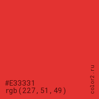Цвет #E33331 в цветовой модели RGB обозначается тремя октетами (227, 51, 49) в десятичном формате и #E33331 в шестнадцатиричном (hex) формате, которые являются интенсивностью красного 227 (hex E3), интенсивность зелёного 51 (hex 33) и интенсивность синего 49 (hex 31).