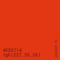Цвет #E33714 в цветовой модели RGB обозначается тремя октетами (227, 55, 20) в десятичном формате и #E33714 в шестнадцатиричном (hex) формате, которые являются интенсивностью красного 227 (hex E3), интенсивность зелёного 55 (hex 37) и интенсивность синего 20 (hex 14).