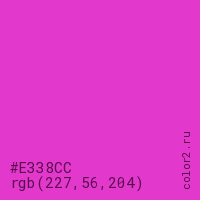 Цвет #E338CC в цветовой модели RGB обозначается тремя октетами (227, 56, 204) в десятичном формате и #E338CC в шестнадцатиричном (hex) формате, которые являются интенсивностью красного 227 (hex E3), интенсивность зелёного 56 (hex 38) и интенсивность синего 204 (hex CC).