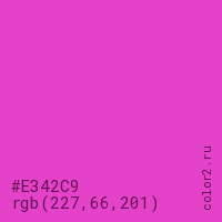 Цвет #E342C9 в цветовой модели RGB обозначается тремя октетами (227, 66, 201) в десятичном формате и #E342C9 в шестнадцатиричном (hex) формате, которые являются интенсивностью красного 227 (hex E3), интенсивность зелёного 66 (hex 42) и интенсивность синего 201 (hex C9).