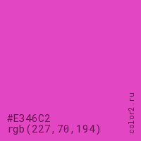 Цвет #E346C2 в цветовой модели RGB обозначается тремя октетами (227, 70, 194) в десятичном формате и #E346C2 в шестнадцатиричном (hex) формате, которые являются интенсивностью красного 227 (hex E3), интенсивность зелёного 70 (hex 46) и интенсивность синего 194 (hex C2).