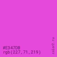 Цвет #E347DB в цветовой модели RGB обозначается тремя октетами (227, 71, 219) в десятичном формате и #E347DB в шестнадцатиричном (hex) формате, которые являются интенсивностью красного 227 (hex E3), интенсивность зелёного 71 (hex 47) и интенсивность синего 219 (hex DB).