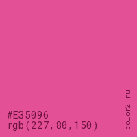 Цвет #E35096 в цветовой модели RGB обозначается тремя октетами (227, 80, 150) в десятичном формате и #E35096 в шестнадцатиричном (hex) формате, которые являются интенсивностью красного 227 (hex E3), интенсивность зелёного 80 (hex 50) и интенсивность синего 150 (hex 96).