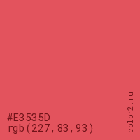 Цвет #E3535D в цветовой модели RGB обозначается тремя октетами (227, 83, 93) в десятичном формате и #E3535D в шестнадцатиричном (hex) формате, которые являются интенсивностью красного 227 (hex E3), интенсивность зелёного 83 (hex 53) и интенсивность синего 93 (hex 5D).