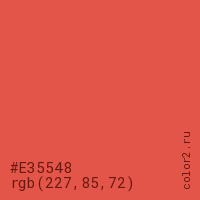 Цвет #E35548 в цветовой модели RGB обозначается тремя октетами (227, 85, 72) в десятичном формате и #E35548 в шестнадцатиричном (hex) формате, которые являются интенсивностью красного 227 (hex E3), интенсивность зелёного 85 (hex 55) и интенсивность синего 72 (hex 48).