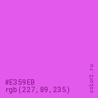 Цвет RGB(227, 89, 235) в процентом отношении количества цвета состоит из 89% красного (red), 34.9% зелёного (green) и 92.2% синего (blue).
