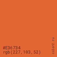 Цвет #E36734 в цветовой модели RGB обозначается тремя октетами (227, 103, 52) в десятичном формате и #E36734 в шестнадцатиричном (hex) формате, которые являются интенсивностью красного 227 (hex E3), интенсивность зелёного 103 (hex 67) и интенсивность синего 52 (hex 34).