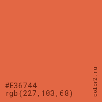 Цвет #E36744 в цветовой модели RGB обозначается тремя октетами (227, 103, 68) в десятичном формате и #E36744 в шестнадцатиричном (hex) формате, которые являются интенсивностью красного 227 (hex E3), интенсивность зелёного 103 (hex 67) и интенсивность синего 68 (hex 44).
