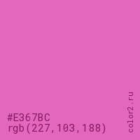 Цвет #E367BC в цветовой модели RGB обозначается тремя октетами (227, 103, 188) в десятичном формате и #E367BC в шестнадцатиричном (hex) формате, которые являются интенсивностью красного 227 (hex E3), интенсивность зелёного 103 (hex 67) и интенсивность синего 188 (hex BC).