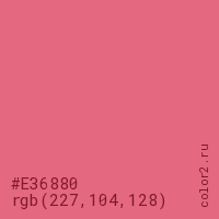 Цвет #E36880 в цветовой модели RGB обозначается тремя октетами (227, 104, 128) в десятичном формате и #E36880 в шестнадцатиричном (hex) формате, которые являются интенсивностью красного 227 (hex E3), интенсивность зелёного 104 (hex 68) и интенсивность синего 128 (hex 80).
