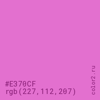 Цвет #E370CF в цветовой модели RGB обозначается тремя октетами (227, 112, 207) в десятичном формате и #E370CF в шестнадцатиричном (hex) формате, которые являются интенсивностью красного 227 (hex E3), интенсивность зелёного 112 (hex 70) и интенсивность синего 207 (hex CF).